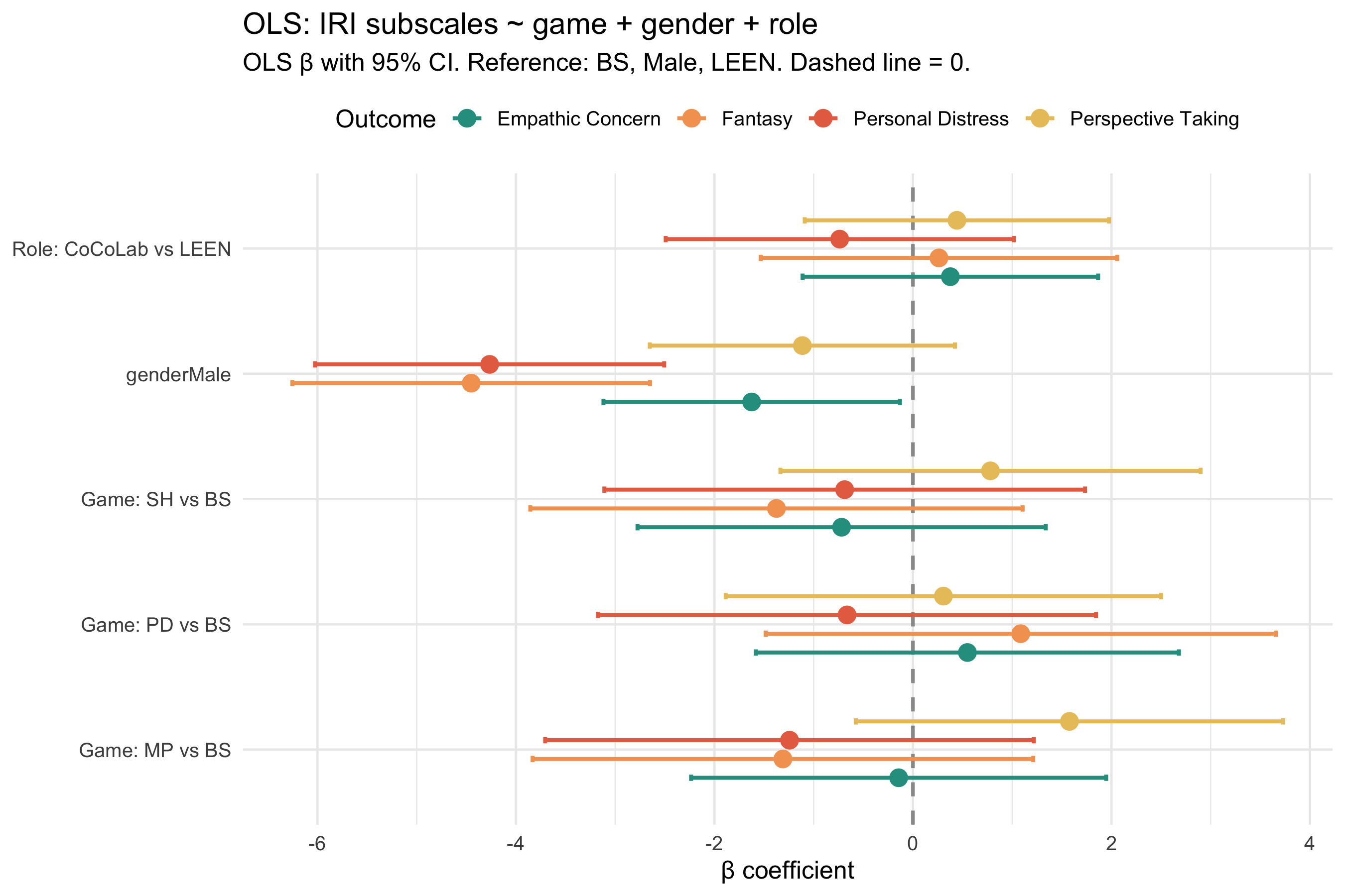 Figure 3: Forest plot: OLS β with 95% CI for IRI subscales (game + gender + role). Game effects (vs BS), gender (Female vs Male), and role (CoCoLab vs LEEN) shown side by side.