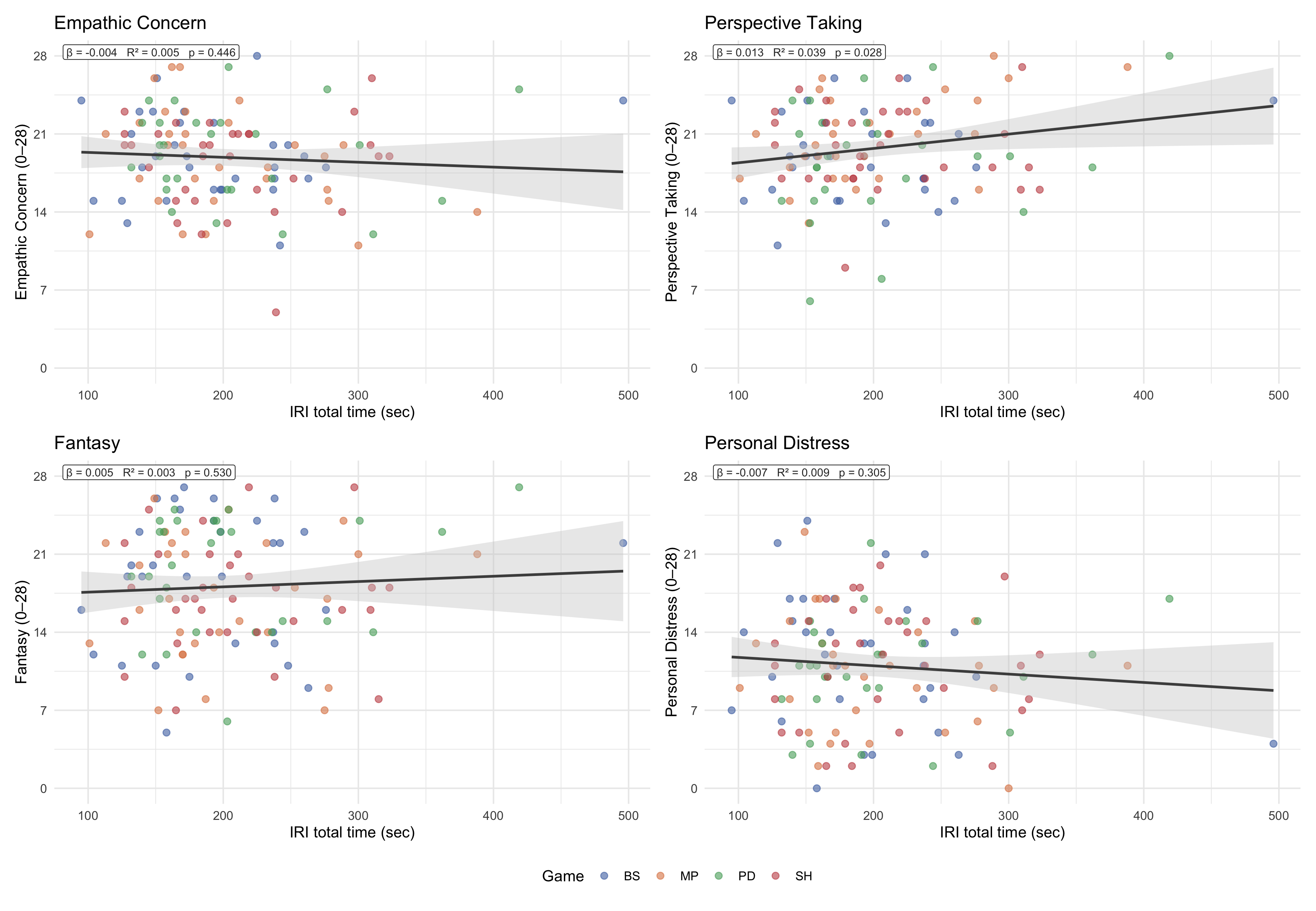 Figure 4: IRI total completion time vs each of the four subscales (Empathic Concern, Perspective Taking, Fantasy, Personal Distress). OLS line with 95% CI; annotation reports β, R², p-value. Points coloured by game.