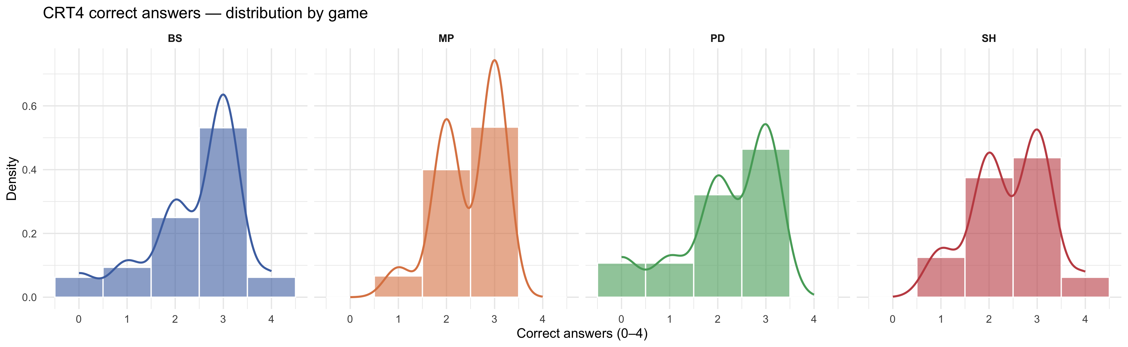 #| fig-cap: "Distribution of CRT4 correct answers (0–4) by game. Histogram with overlaid kernel density. Scores range 0–4 (4-item version)."