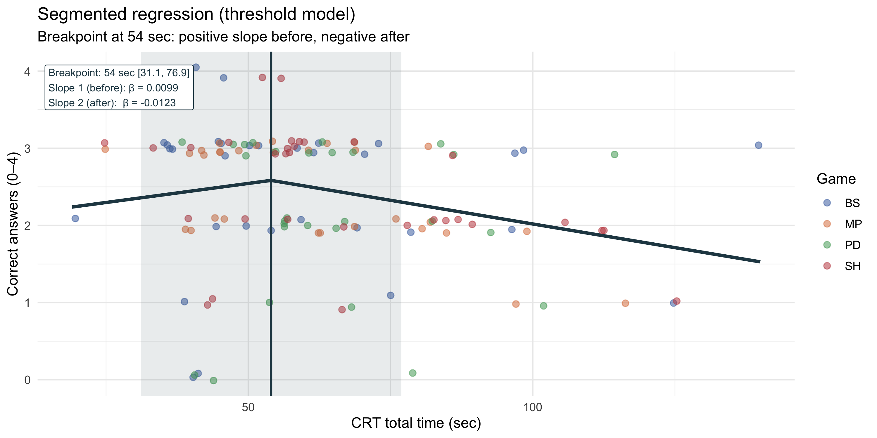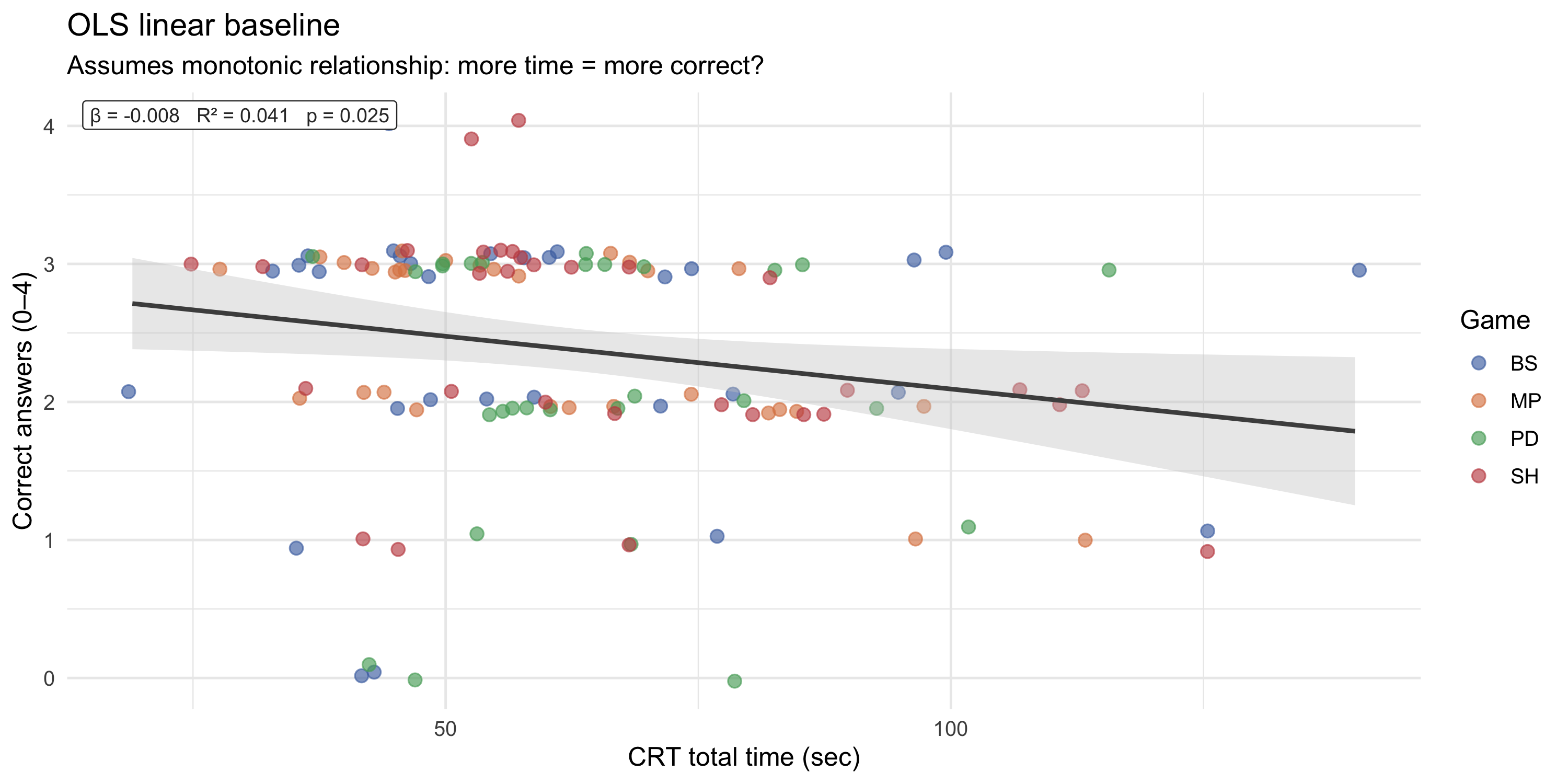 The linear model provides the simplest summary: does spending more time on the CRT predict better performance? However, it imposes a constant marginal effect of time across the entire range and cannot capture the hypothesised threshold.