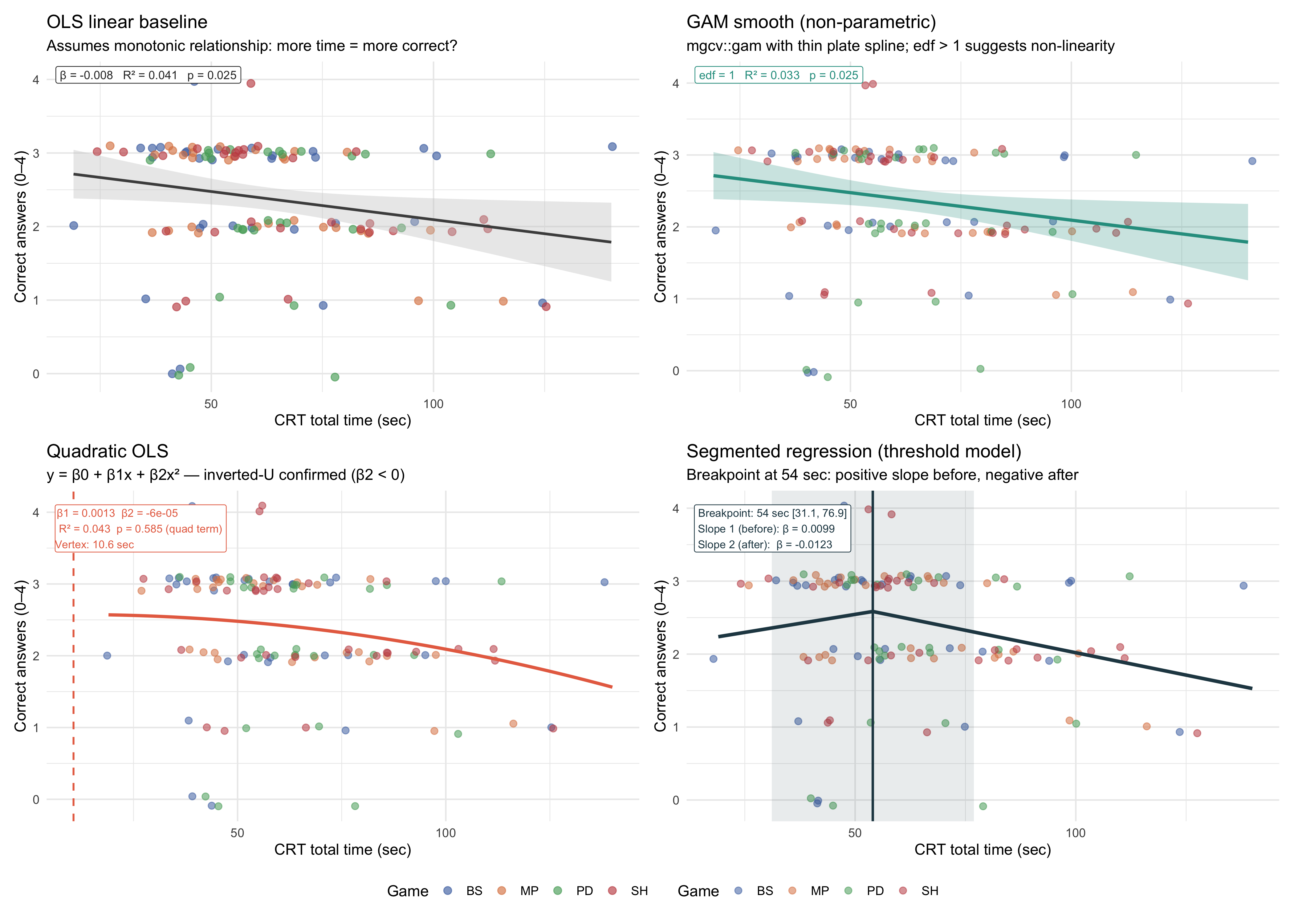 #| fig-cap: "Comparison of four approaches to modelling CRT time → accuracy. Top-left: OLS linear. Top-right: GAM smooth. Bottom-left: Quadratic OLS. Bottom-right: Segmented regression with estimated breakpoint."