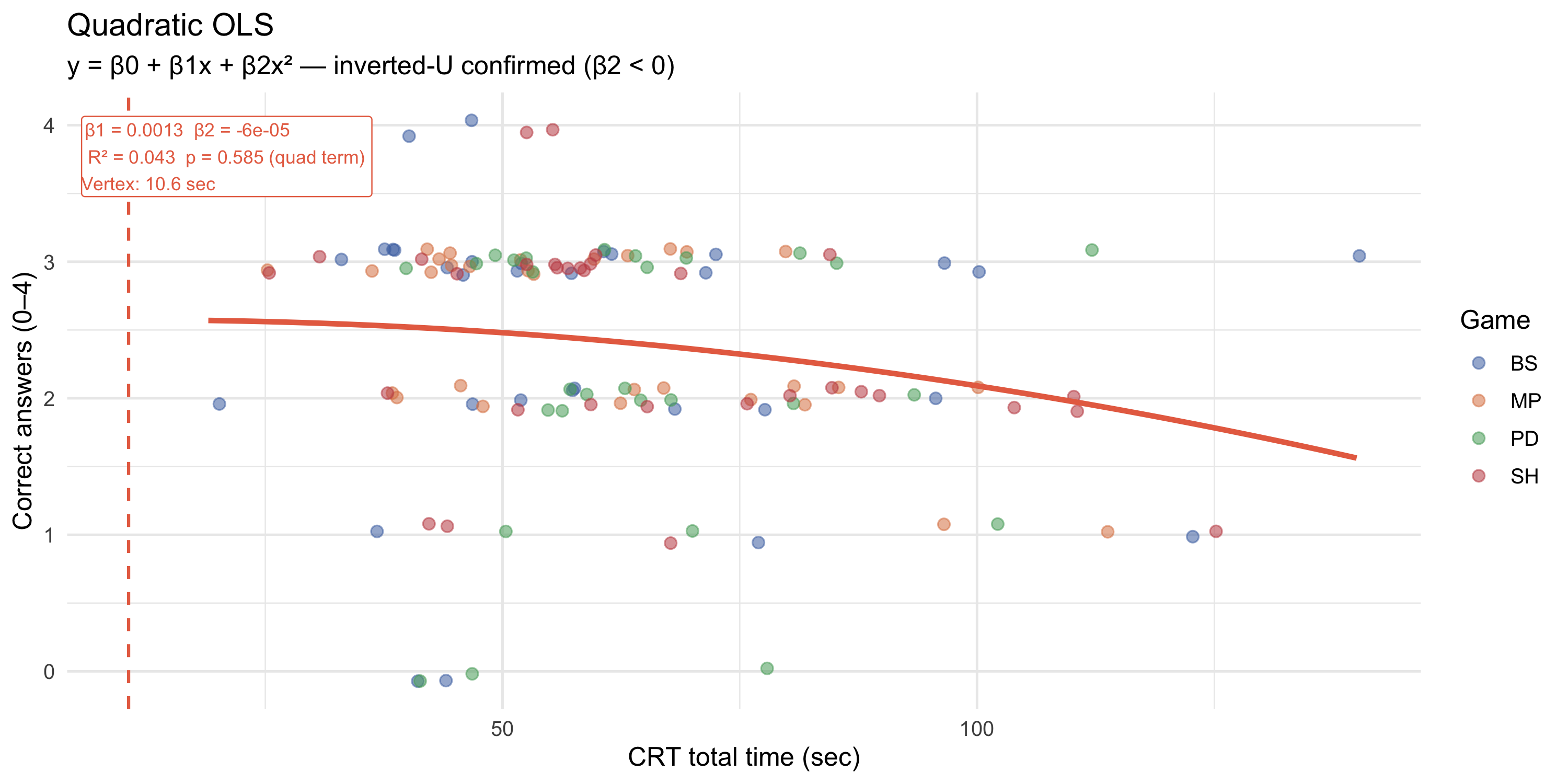 On the CRT, longer deliberation time is theoretically associated with successful override of intuitive errors. However, this relationship may be **non-monotonic**: while moderate reflection time helps participants override intuitive (wrong) answers, participants who spend *very long* times may be those who struggle with the task — extra time reflects difficulty rather than productive deliberation. We investigate this hypothesis progressively: linear baseline → non-parametric smooth → quadratic test → segmented regression with estimated breakpoint.
