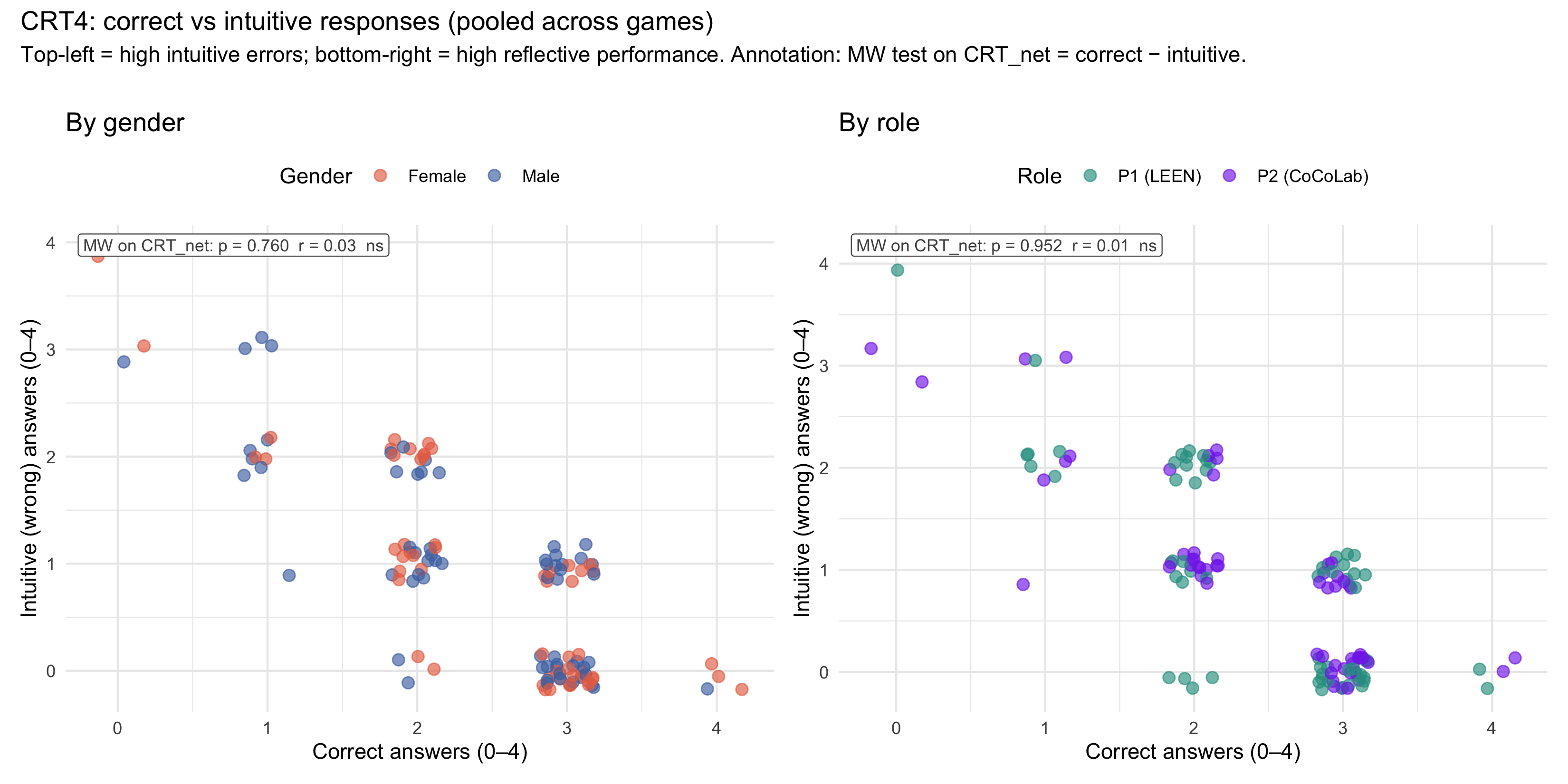 #| fig-cap: "CRT4 correct vs intuitive answers, pooled across game conditions. Left: by gender; right: by role. Annotation: Mann-Whitney U test on CRT~net~ (= correct − intuitive). Bottom-right = high reflective performance; top-left = predominantly intuitive."