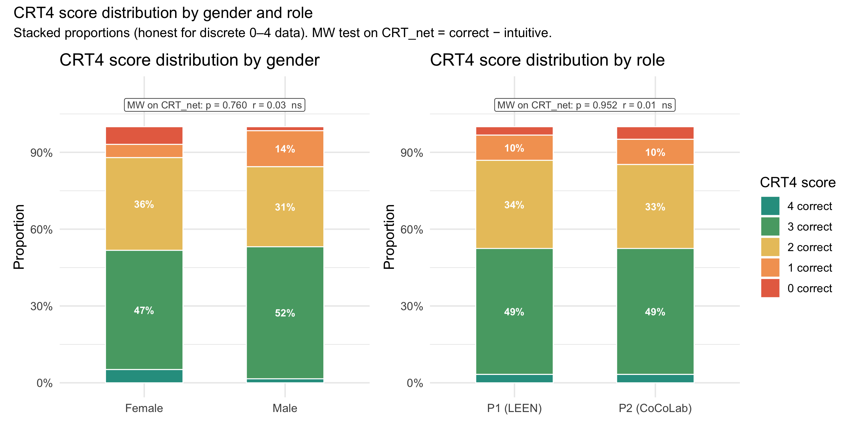 #| fig-cap: "CRT4 score distribution by gender (left) and by lab role (right). Stacked proportion bars show the share of participants at each discrete score level (0–4): rosso = 0 correct → teal = 4 correct. Labels show % where ≥ 7%. Annotation: Mann-Whitney U on CRT_net = correct − intuitive with rank-biserial r."