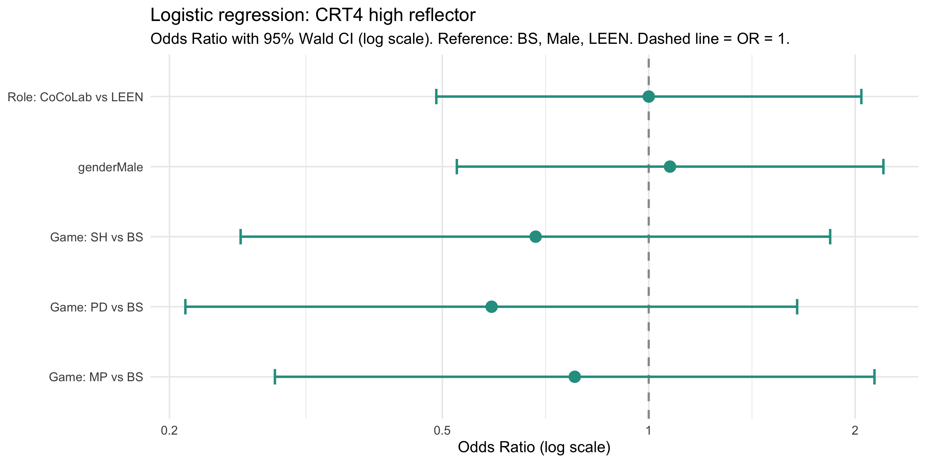 #| fig-cap: "Logistic regression odds ratios (OR) with 95% Wald CI for CRT4 high-reflector outcome (correct ≥ 3). Log scale: values > 1 = higher odds of being a high reflector; values < 1 = lower odds. Reference: BS, Male, LEEN. Dashed line at OR = 1."