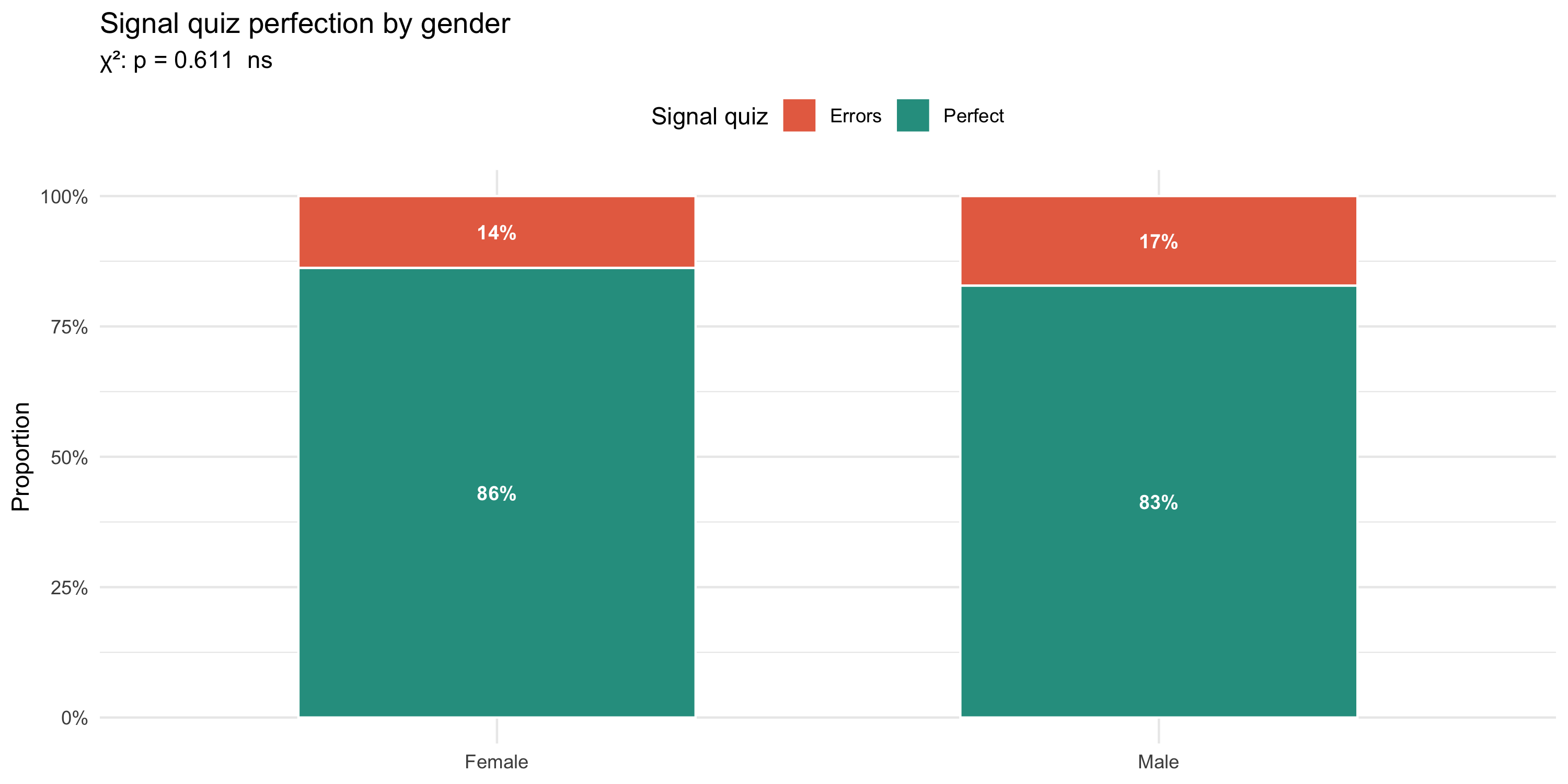 #| fig-cap: "Proportion achieving a perfect signal-quiz score (Q7–9), by gender. χ² test (Monte Carlo) shown in subtitle."