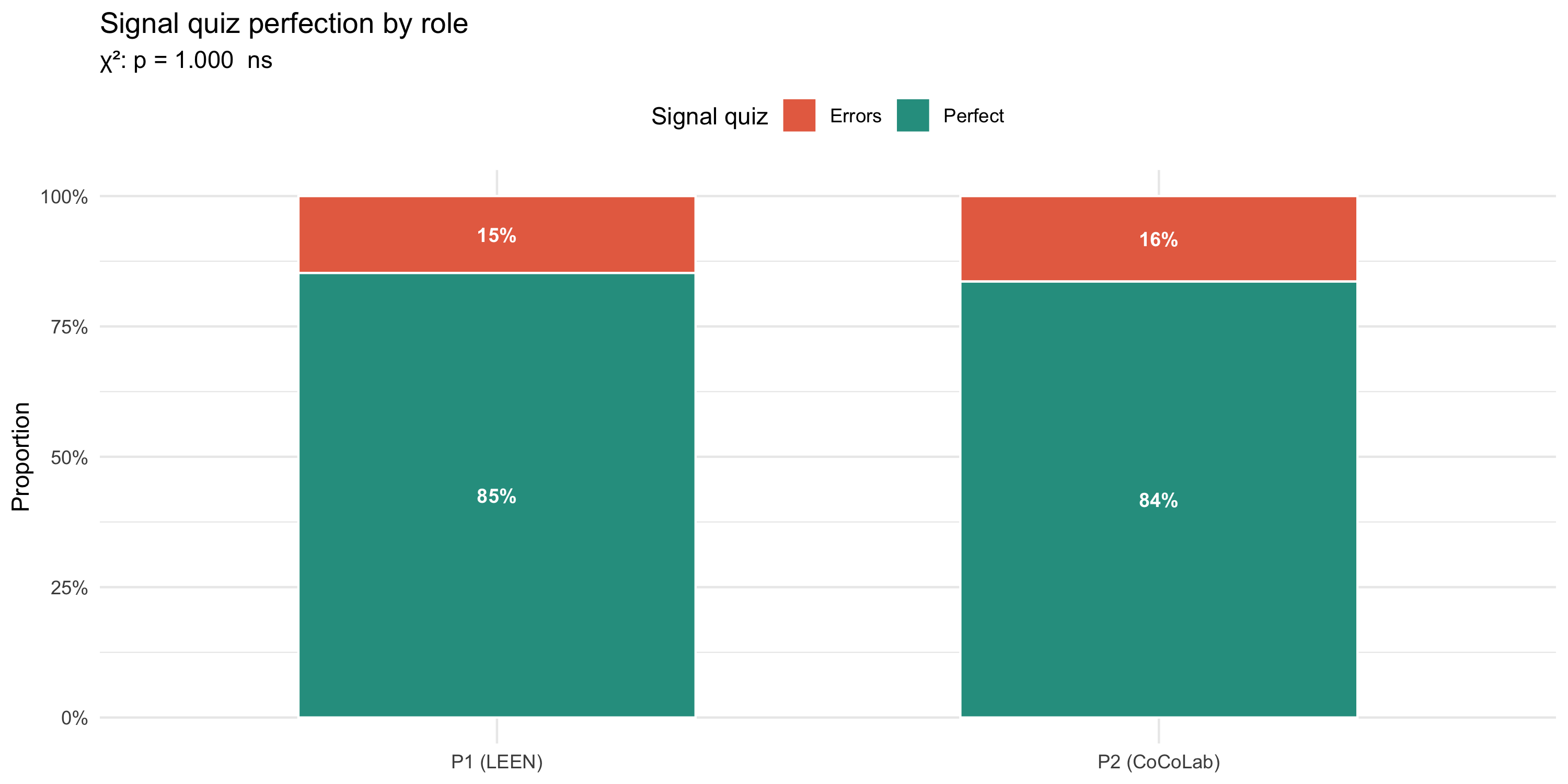 #| fig-cap: "Proportion achieving a perfect signal-quiz score, by lab role. χ² test (Monte Carlo) shown in subtitle."
