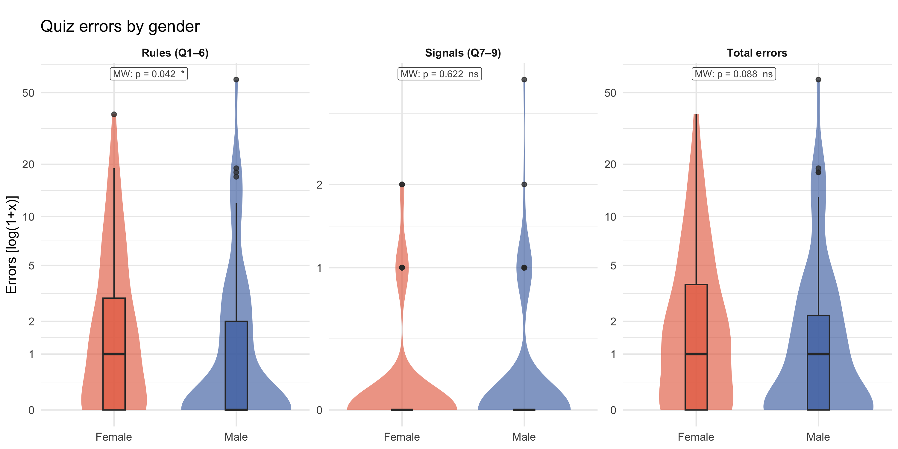 #| fig-cap: "Distribution of quiz errors (rules Q1–6, signals Q7–9, total) by gender [log(1+x) y-axis]. Violin + boxplot overlay, pooled across all games. Tick labels show raw error counts. Mann-Whitney U test p-value shown at the top-left of each panel."
