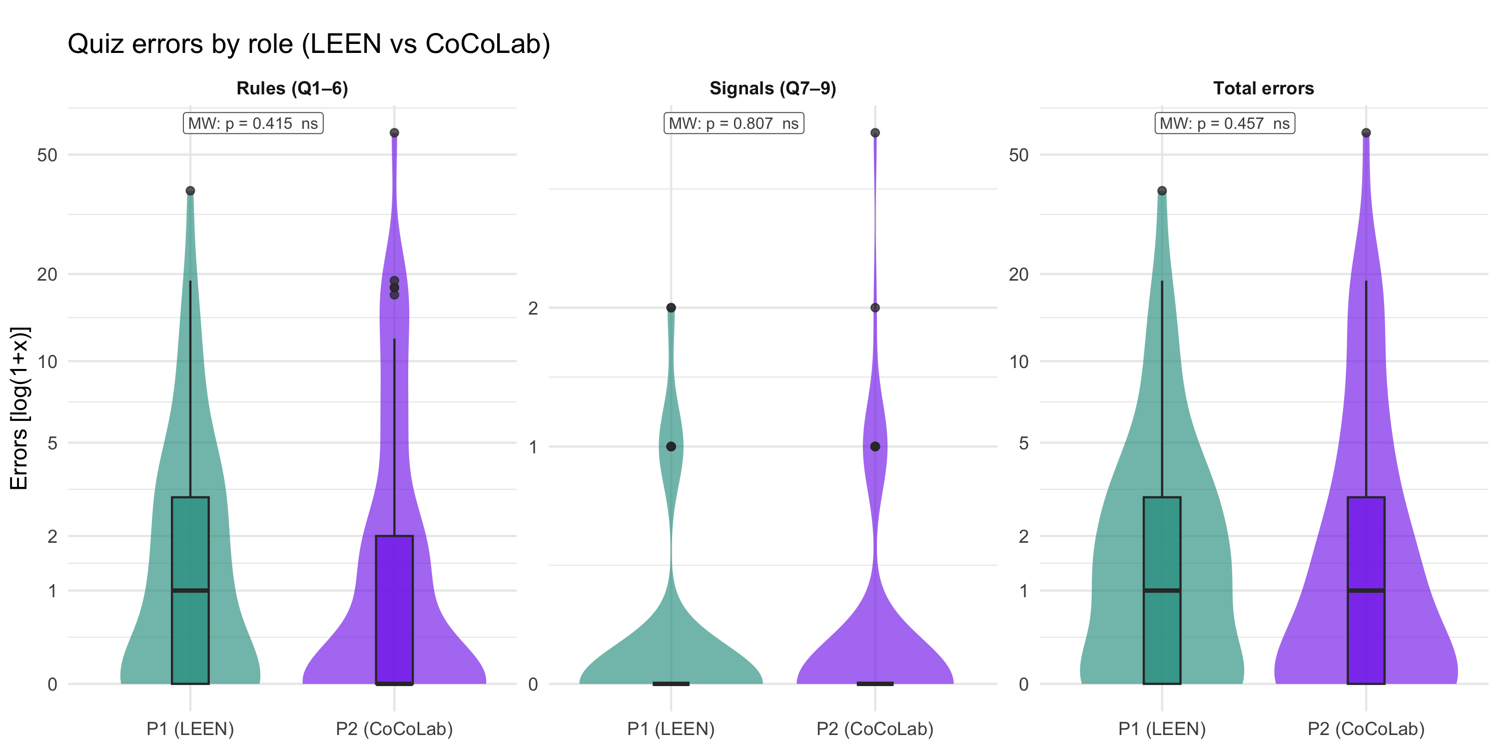 #| fig-cap: "Distribution of quiz errors (rules Q1–6, signals Q7–9, total) by lab role [log(1+x) y-axis]. Violin + boxplot overlay, pooled across all games. Tick labels show raw error counts. Mann-Whitney U test p-value shown at the top-left of each panel."
