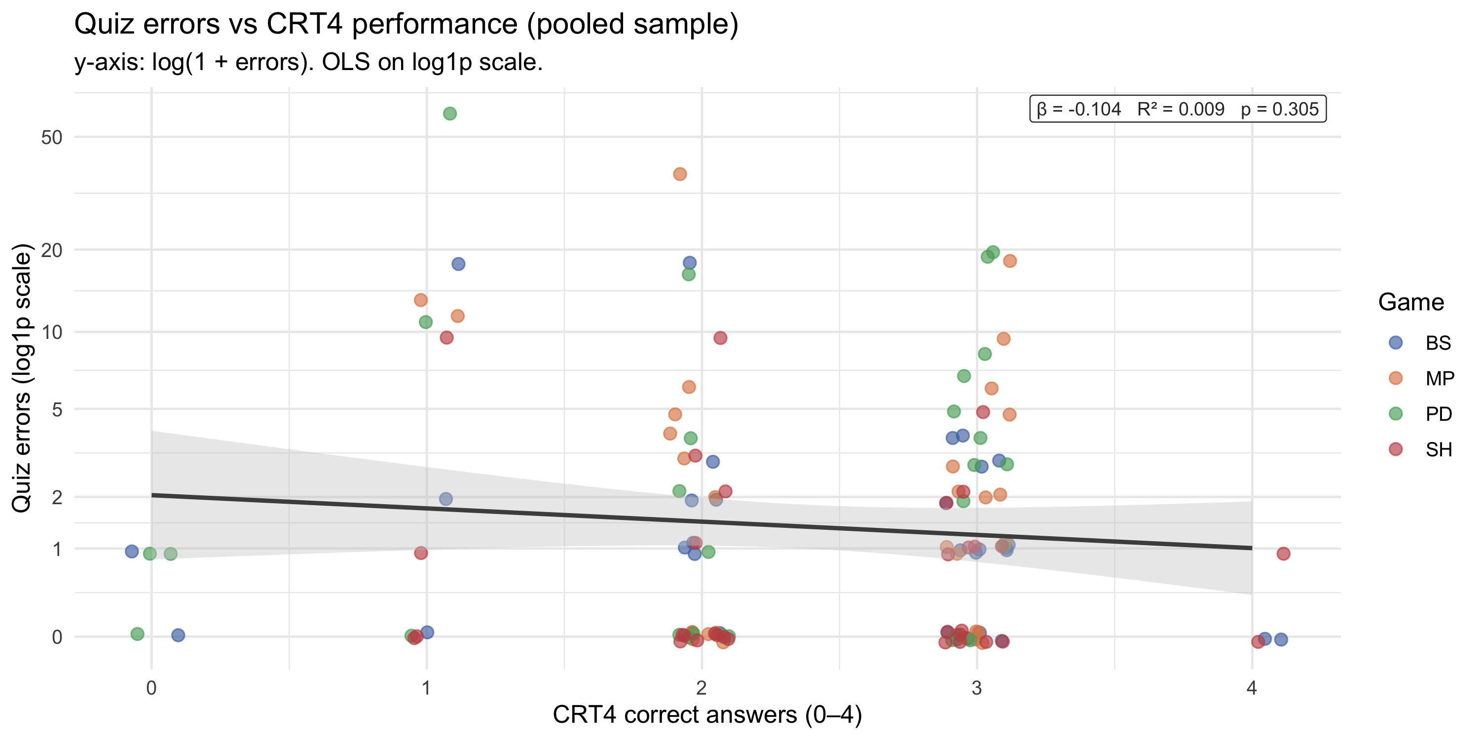 #| fig-cap: "Total quiz errors [log(1+x) scale] against CRT4 correct answers. OLS line fitted on the log1p-transformed outcome; top-right label reports β, R², and p-value. Tick labels show raw error counts. Points coloured by game."