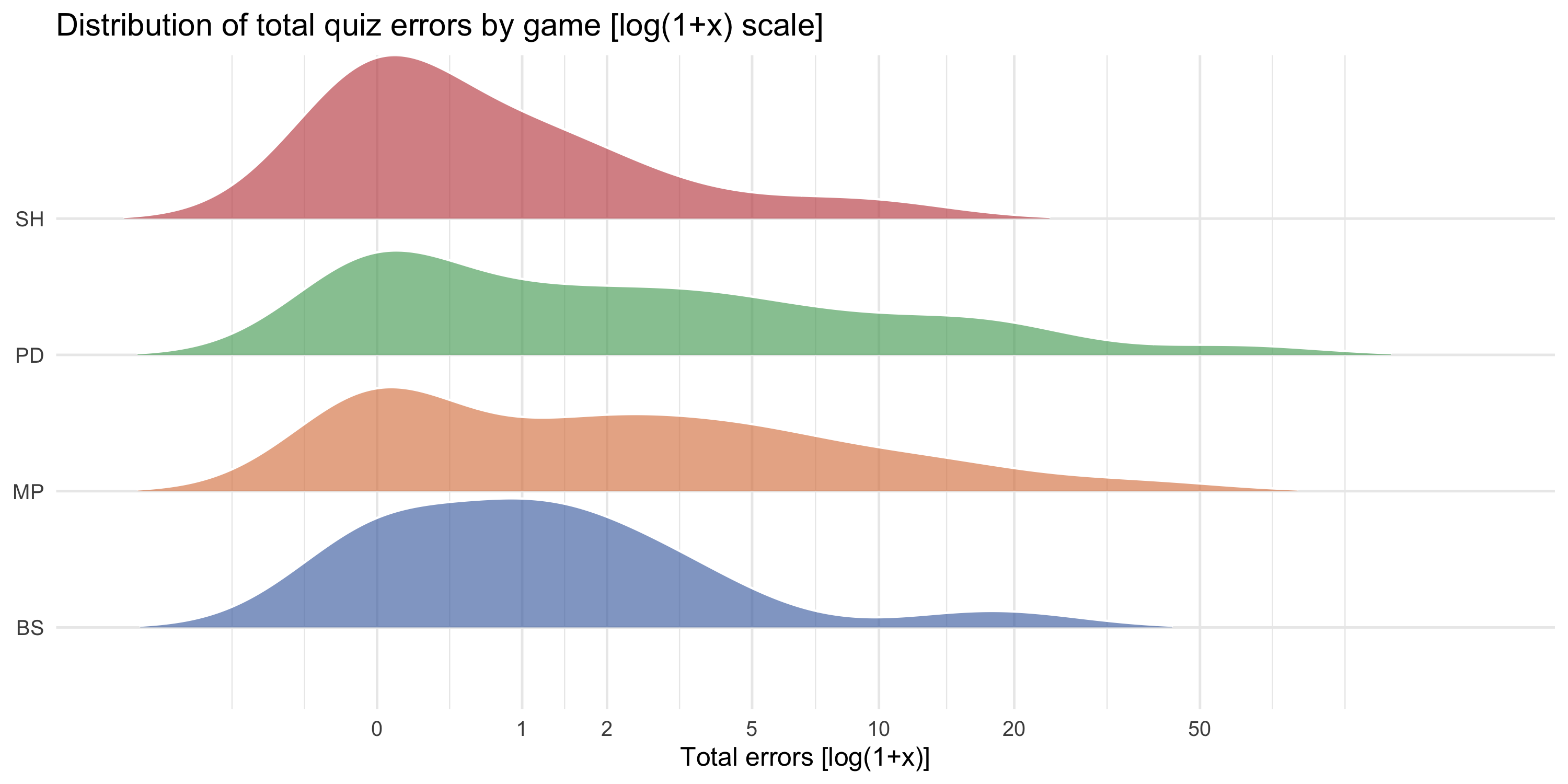 #| fig-cap: "Ridgeline density of total quiz errors by game [log(1+x) scale]. Tick labels show raw error counts. Strong right skew is typical: most participants made few errors, with a long tail in every condition."