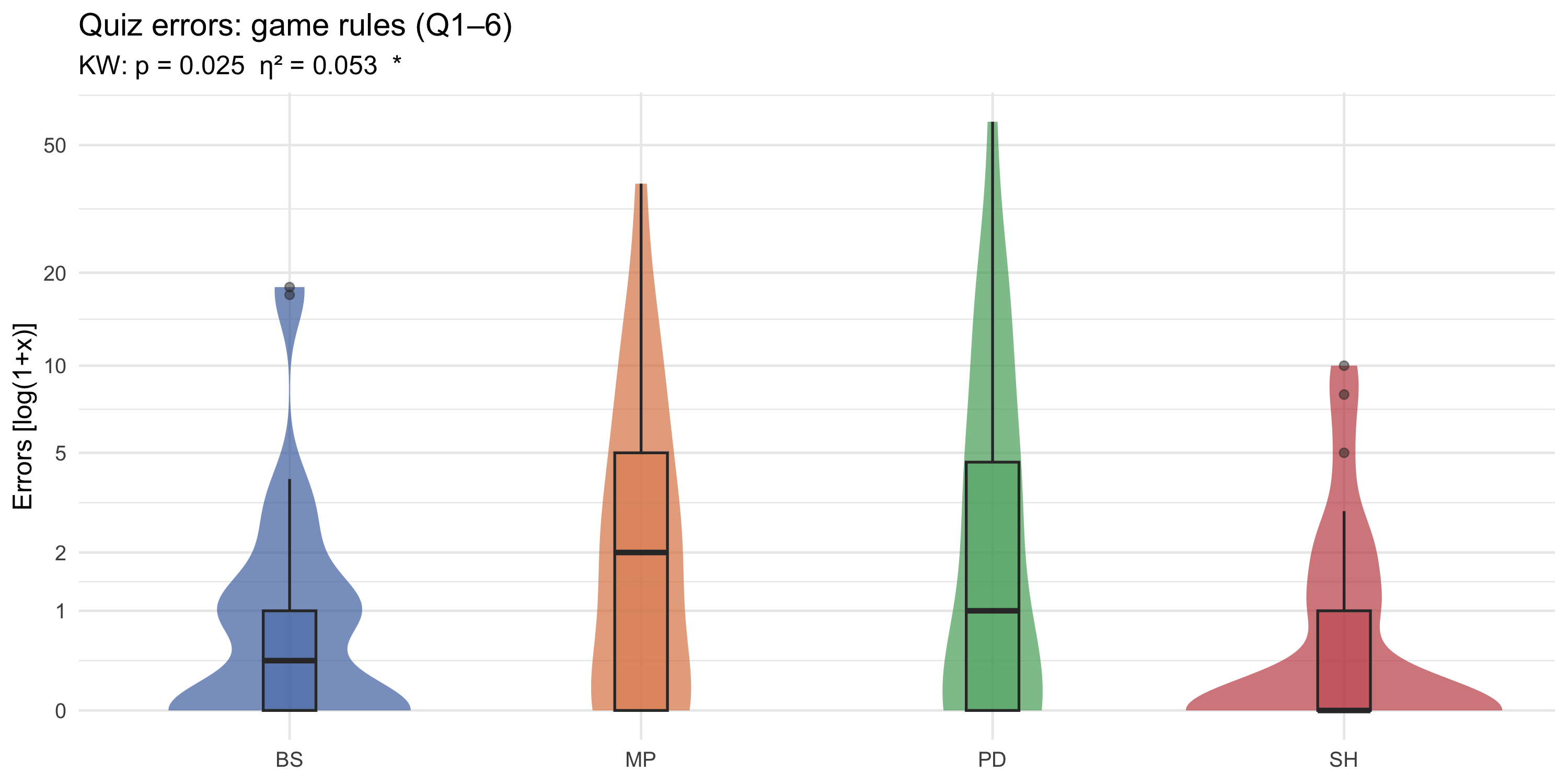 #| fig-cap: "Distribution of errors on game-rules questions (Q1–Q6) by game (log1p y-axis). Violin width shows density; box plot overlay shows quartiles. The log(1+x) transformation compresses the right tail; tick labels show raw error counts."
