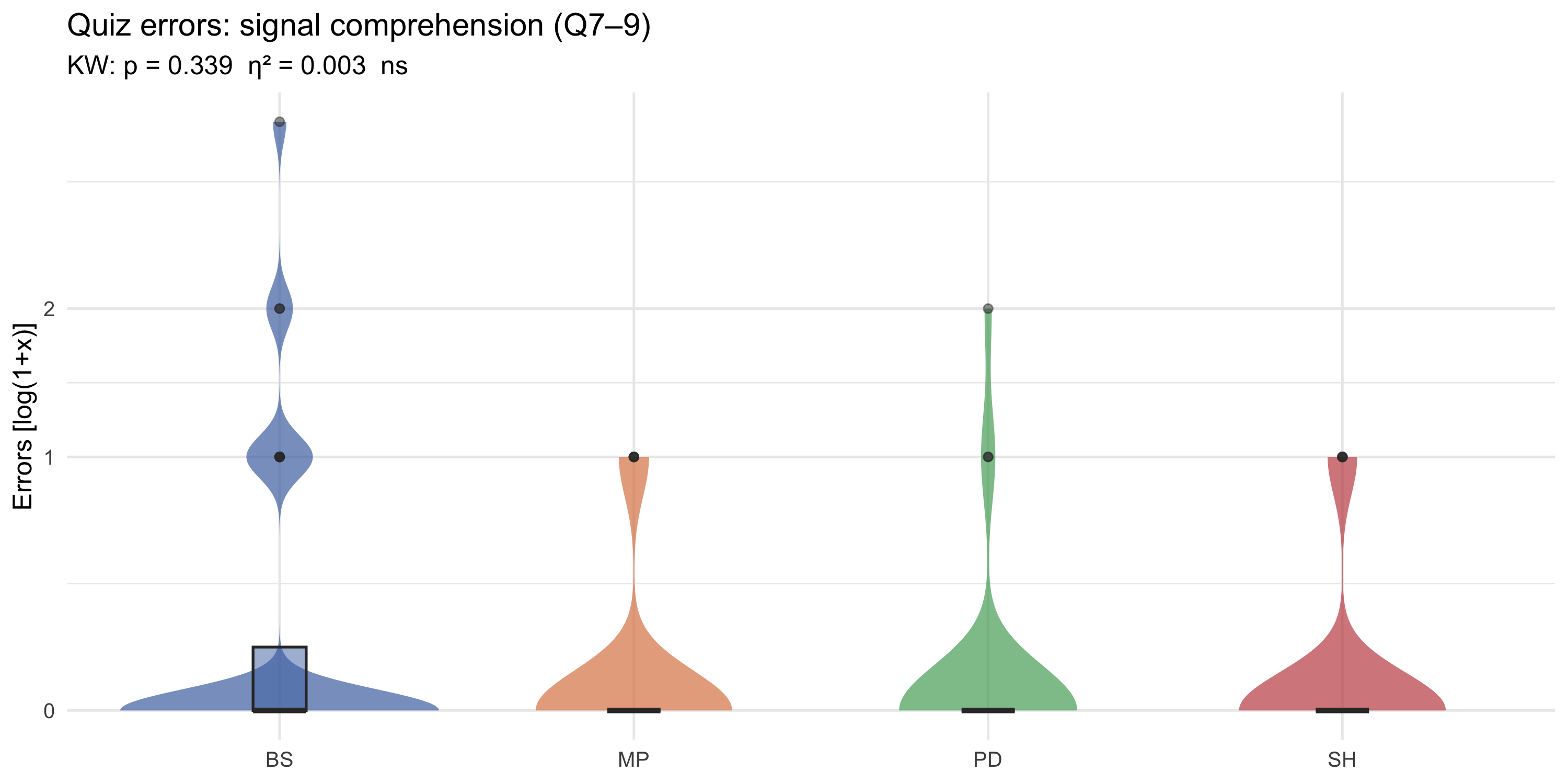 #| fig-cap: "Distribution of errors on signal-comprehension questions (Q7–Q9) by game (log1p y-axis). Violin width shows density; box plot overlay shows quartiles. Tick labels show raw error counts."